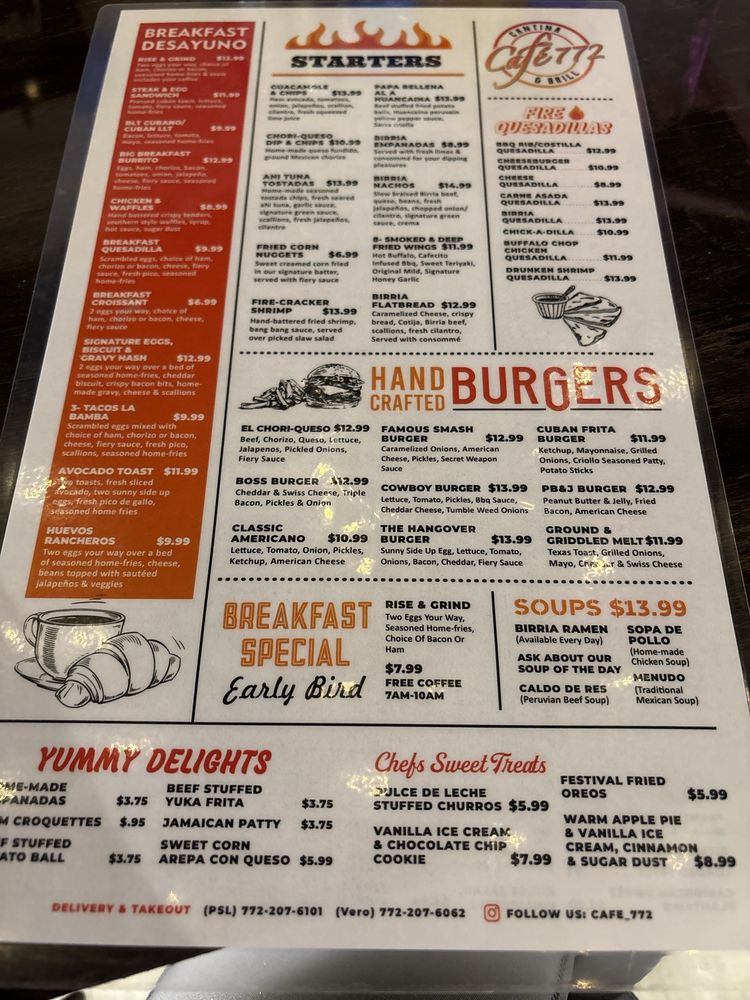 Welcome to Cafe772 Cantina & Grill, your new go-to spot for a vibrant taste of Latin American cuisine right in Port St. Lucie! Nestled at 331 SE Port St Lucie Blvd, this cozy cantina specializes in a mouth-watering breakfast and brunch menu, alongside delectable sandwiches. Their signature dish, Birria Beef Nachos, promises a fiesta of flavors for just $16.99. Don't miss the Caramel Churros, a sweet delight to finish your meal, priced at $6.99.